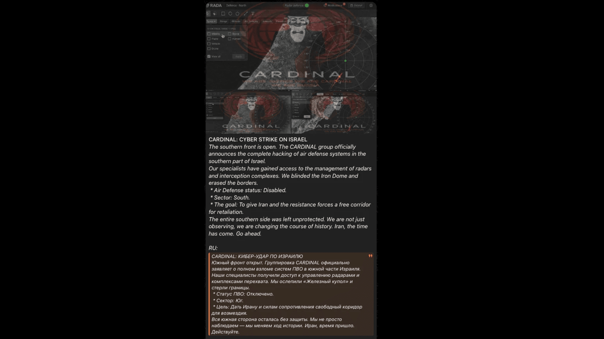 O grupo Cardinal anunciou ter comprometido os sistemas de defesa aérea no sul de Israel, incluindo o Iron Dome e