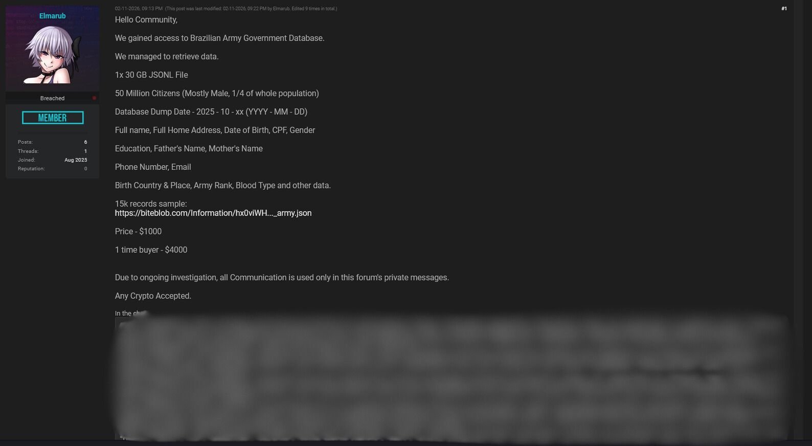 No último mês de fevereiro, um cibercriminoso anunciou a venda de um suposto banco de dados do Exército Brasileiro em