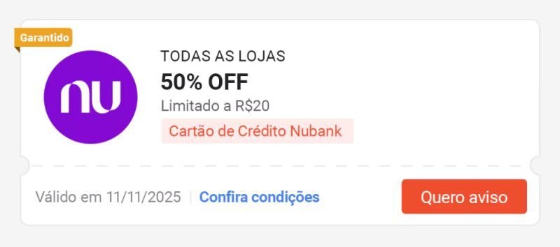 Além do cupom de 50% de desconto limitado a R$ 20 em todas as lojas da Shopee para compras com cartão de crédito Nubank, a fintech vai disponibilizar vários outros benefícios associados ao evento de compras que antecede a Black Friday. Entre eles, há mais opções de cupons que variam conforme o valor da compra.