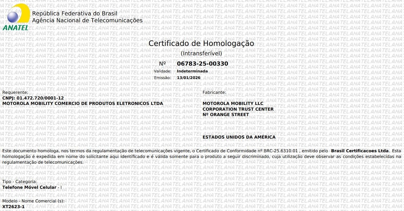 A homologação do dispositivo foi realizada na última terça-feira (13), data que coincide com a homologação do vindouro Motorola Razr 70. O despacho da documentação indica que ambos os smartphones devem chegar ao mercado brasileiro muito em breve, por mais que os arquivos não revelem detalhes sobre uma data exata.