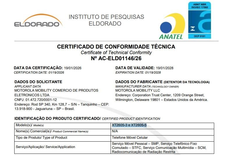 A Anatel (Agência Nacional de Telecomunicações) homologou o próximo Motorola Edge 70 Fusion no Brasil nos últimos dias. Com número de série XT2605-3 e XT2605-5, os aparelhos devem ser lançados no Brasil em breve e já tiveram a ficha técnica vazada quase que completamente nesta semana.