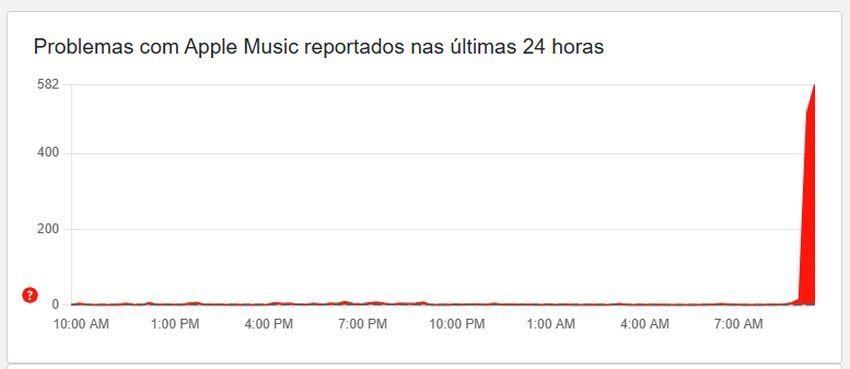 Já às 9h, a quantidade de notificações de erros no streaming musical da Apple chegava a mais de 600, afetando principalmente o app para dispositivos móveis, conforme as queixas. A dificuldade para a reprodução de músicas foi o maior problema relatado.