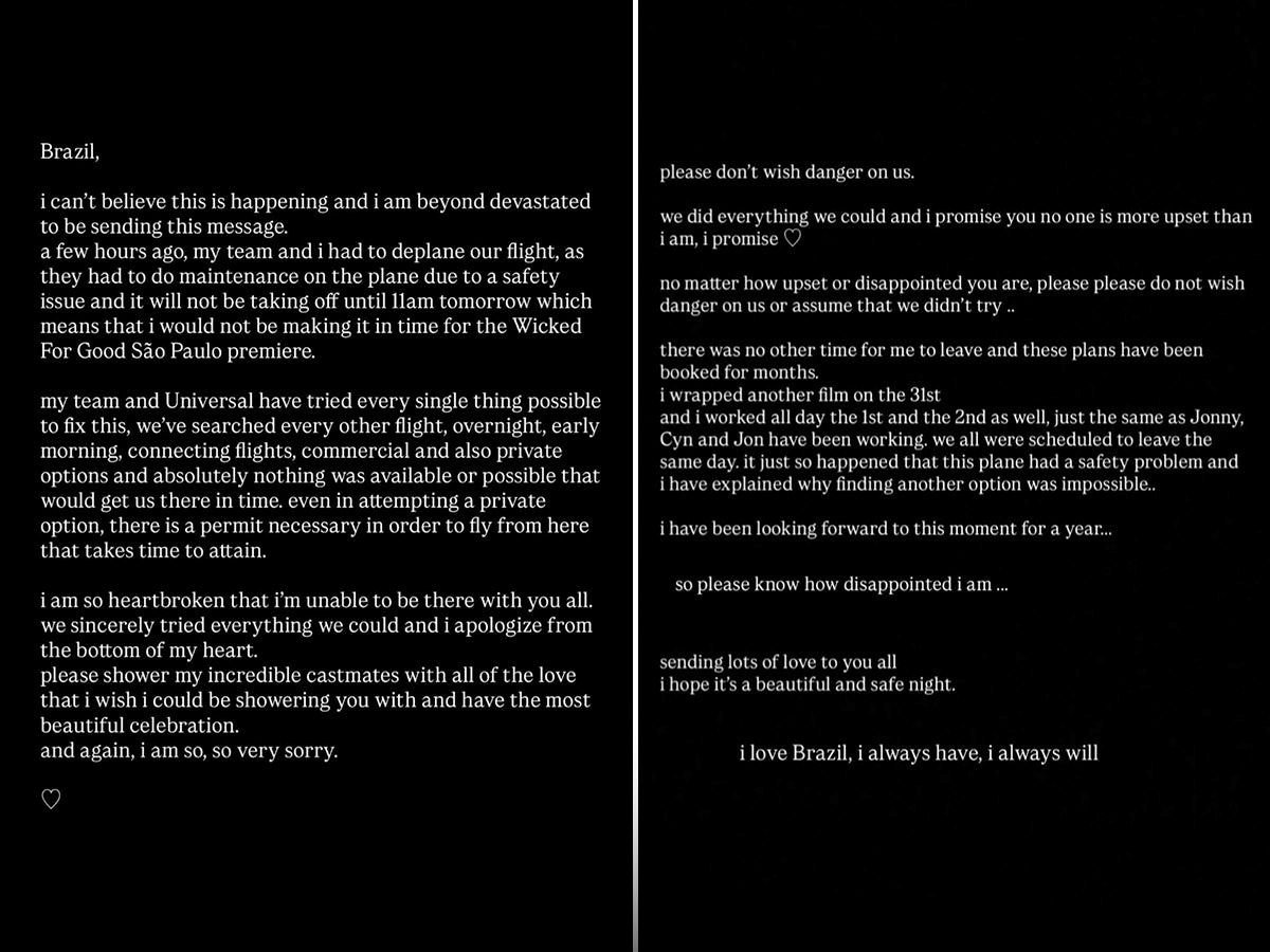 Ariana Grande manda mensagem ao Brasil sobre Wicked 2: ‘Não nos desejem mal’