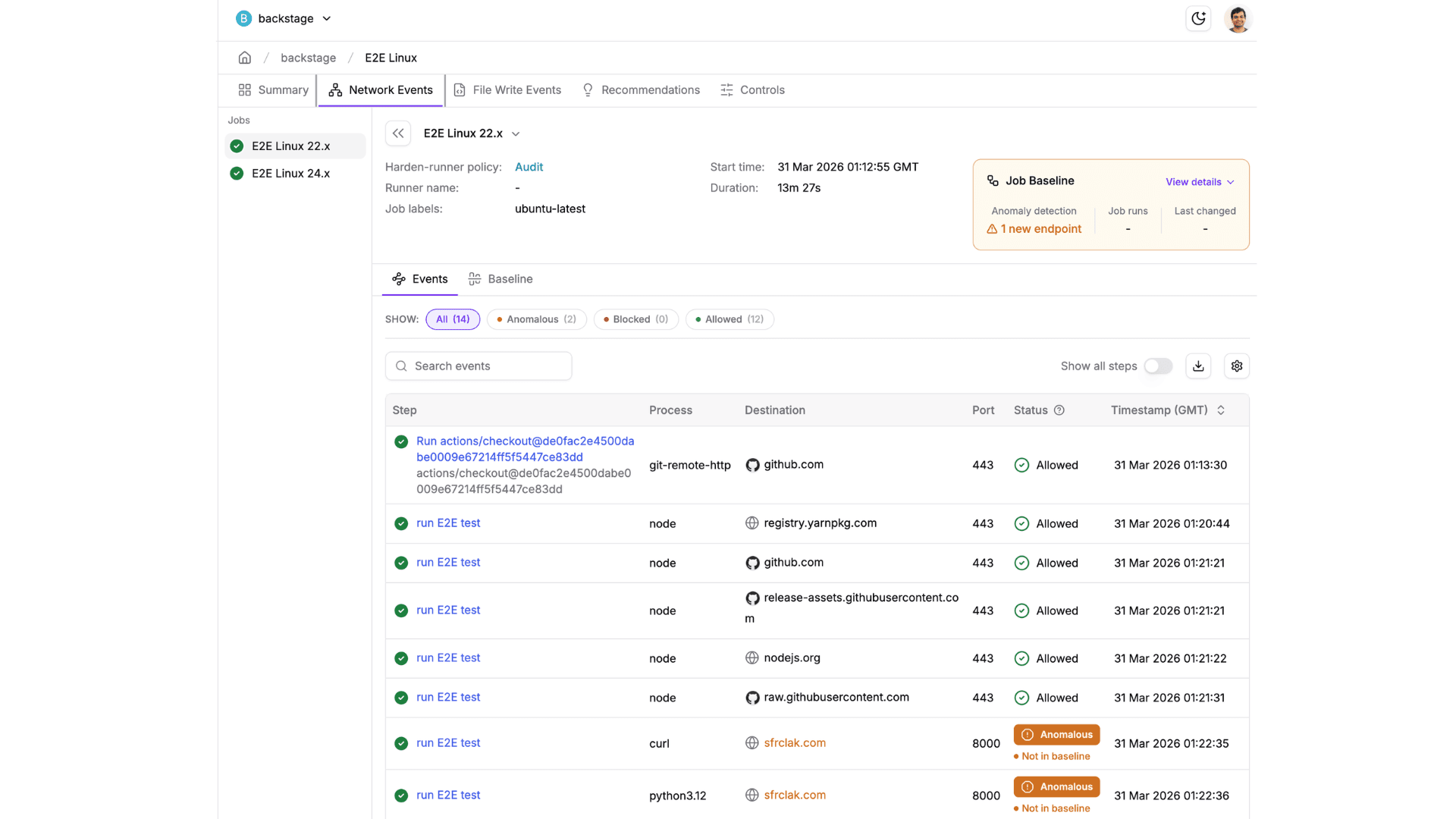 Trinta e seis segundos depois, em uma etapa diferente do workflow, uma segunda conexão ao mesmo servidor foi registrada. Era o payload de segunda etapa já rodando de forma completamente independente, desvinculado de toda a árvore de processos do npm. O malware havia persistido além da etapa que o instalou.