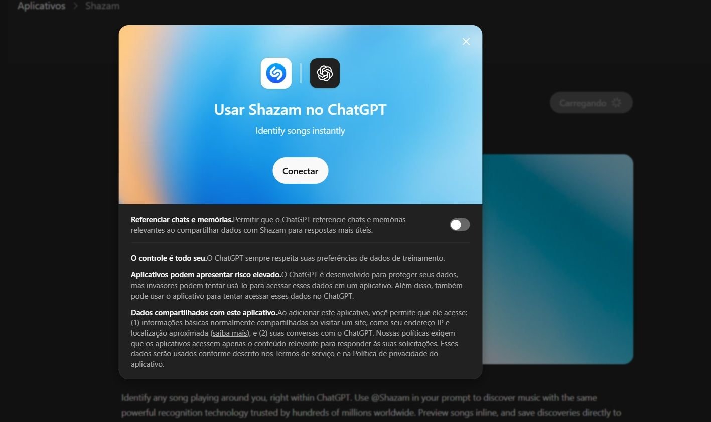 • Na nova janela, toque de novo em “Conectar” para finalizar a integração. Se você quiser que o ChatGPT referencie chats e memórias relevantes (a partir do mecanismo de Memória) ao compartilhar dados com o Shazam para obter respostas mais úteis, é só marcar a caixa que aparece na tela;