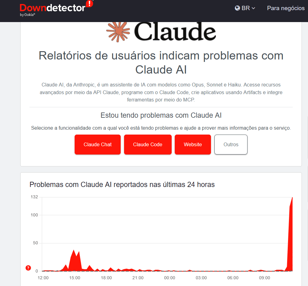 A confirmação de erro também veio pelo próprio site do Claude Status. Às 11h44 a página foi atualizada com uma mensagem de “Estamos investigando esse problema”. Três minutos depois o site informou que a falha estava afetando o login e logout no Claude Code, que é a ferramenta de construção de códigos para IA agêntica.