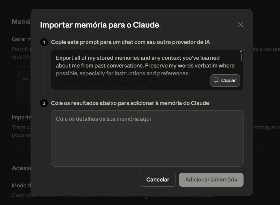 O mecanismo de conversão funciona com tudo o que você já compartilhou com outras ferramentas de IA, como o ChatGPT, Google Gemini e Microsoft Copilot. Ele é capaz de incorporar recursos como histórico e memórias do que você citou para o outro serviço.