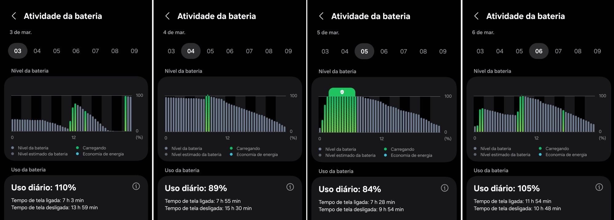 *Vale notar que, em alguns dias, a média passou de 100% de uso. Isso acontece quando o celular recebe uma carga ao longo do dia, seja direto pela tomada ou conectado a outros dispositivos, como computadores.