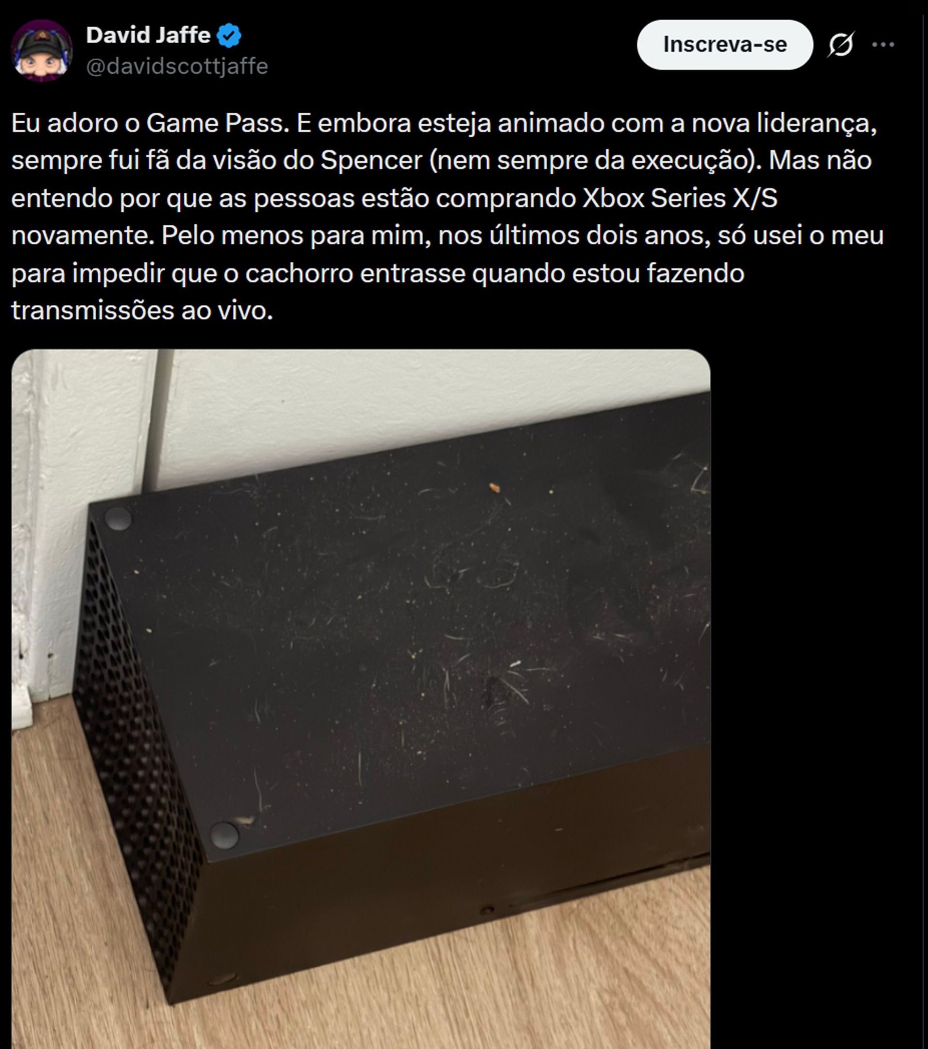 Na mesma publicação, Jaffe comentou sobre o cenário atual da Microsoft e afirmou que, apesar de gostar do Game Pass, não vê motivo para adquirir o hardware. Segundo ele, o aparelho serve “estritamente para impedir que o cachorro entre no quarto”, enquanto também questiona por que jogadores ainda compram o console atualmente.