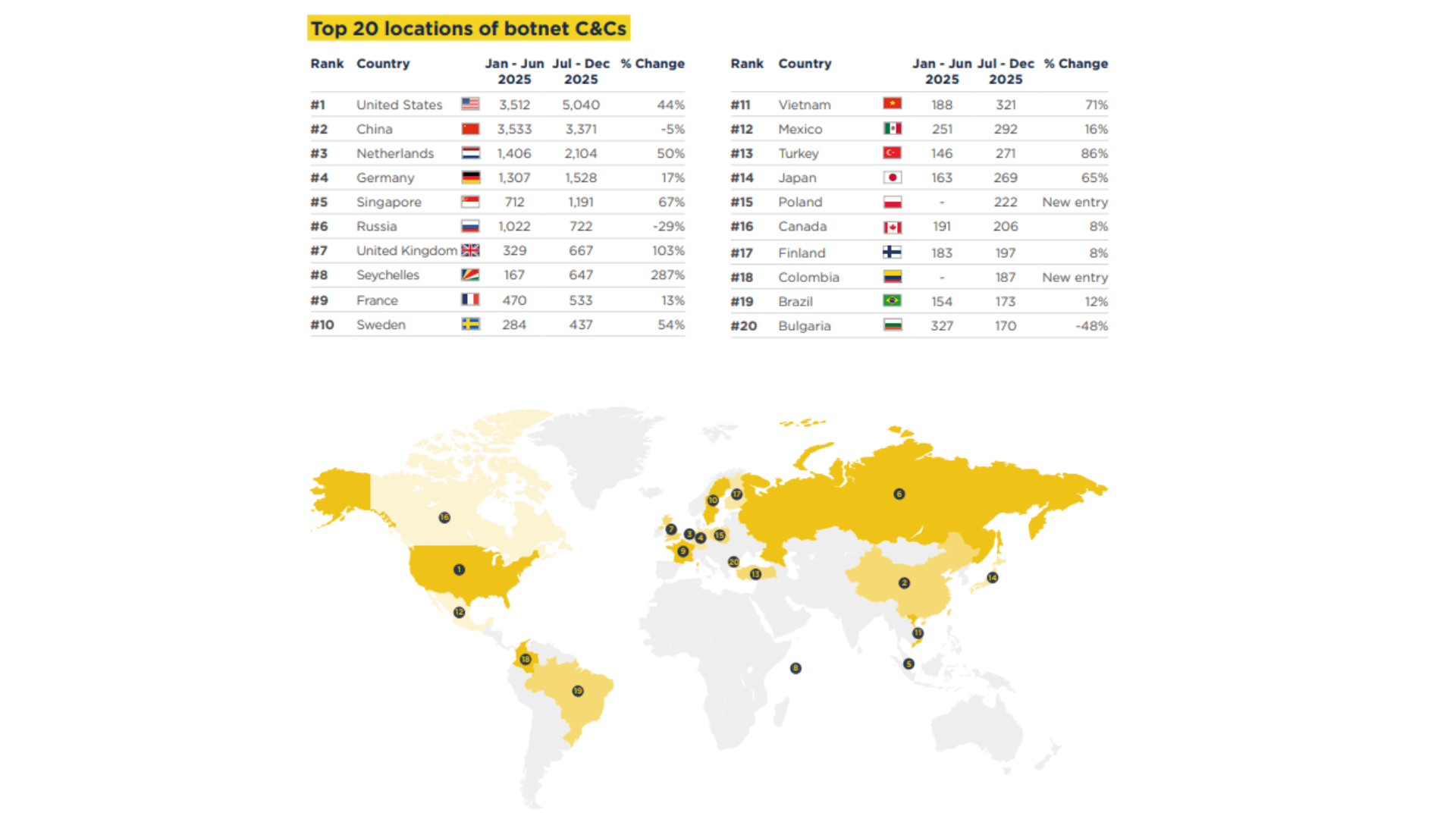 “A atividade de botnets disparou ao longo do último ano, com a Spamhaus registrando aumentos de 26% e 24% nos dois períodos de seis meses de janeiro a junho de 2025 e julho a dezembro de 2025, respectivamente. Esse aumento está associado ao surgimento de bots e dispositivos conectados nos Estados Unidos”, afirma a Pulsedive.