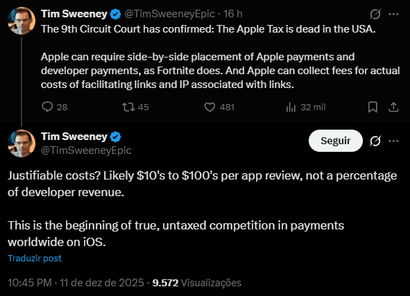 O CEO da Epic Games, Tim Sweeney, comemorou publicamente o fim da chamada “taxa da Apple” nos Estados Unidos. O executivo anunciou o veredicto do Tribunal do 9º Circuito em uma publicação no X nesta quinta-feira (11), classificando a decisão como um marco para a competição no ecossistema iOS.