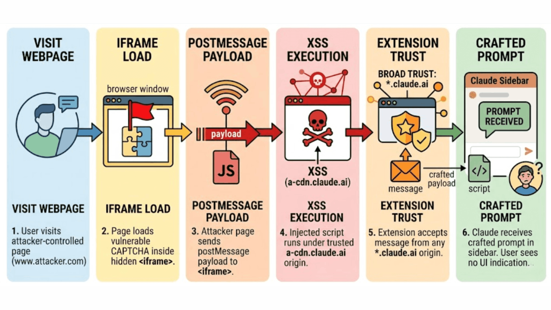 Para executar o ataque, um agente malicioso precisava apenas publicar uma página que carregasse o CAPTCHA vulnerável em um iframe oculto. Via postMessage, o atacante disparava o XSS nesse contexto, executando JavaScript sob a origem a-cdn.claude.ai.