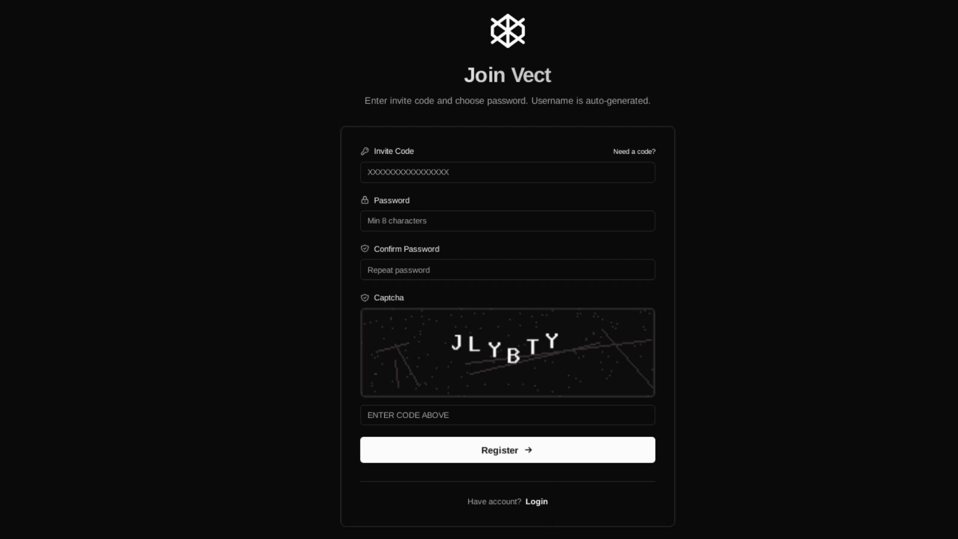 Página de login do RaaS do Vect pedia o código de convite e senha, garantindo exclusividade do site. Imagem: RedPiranha