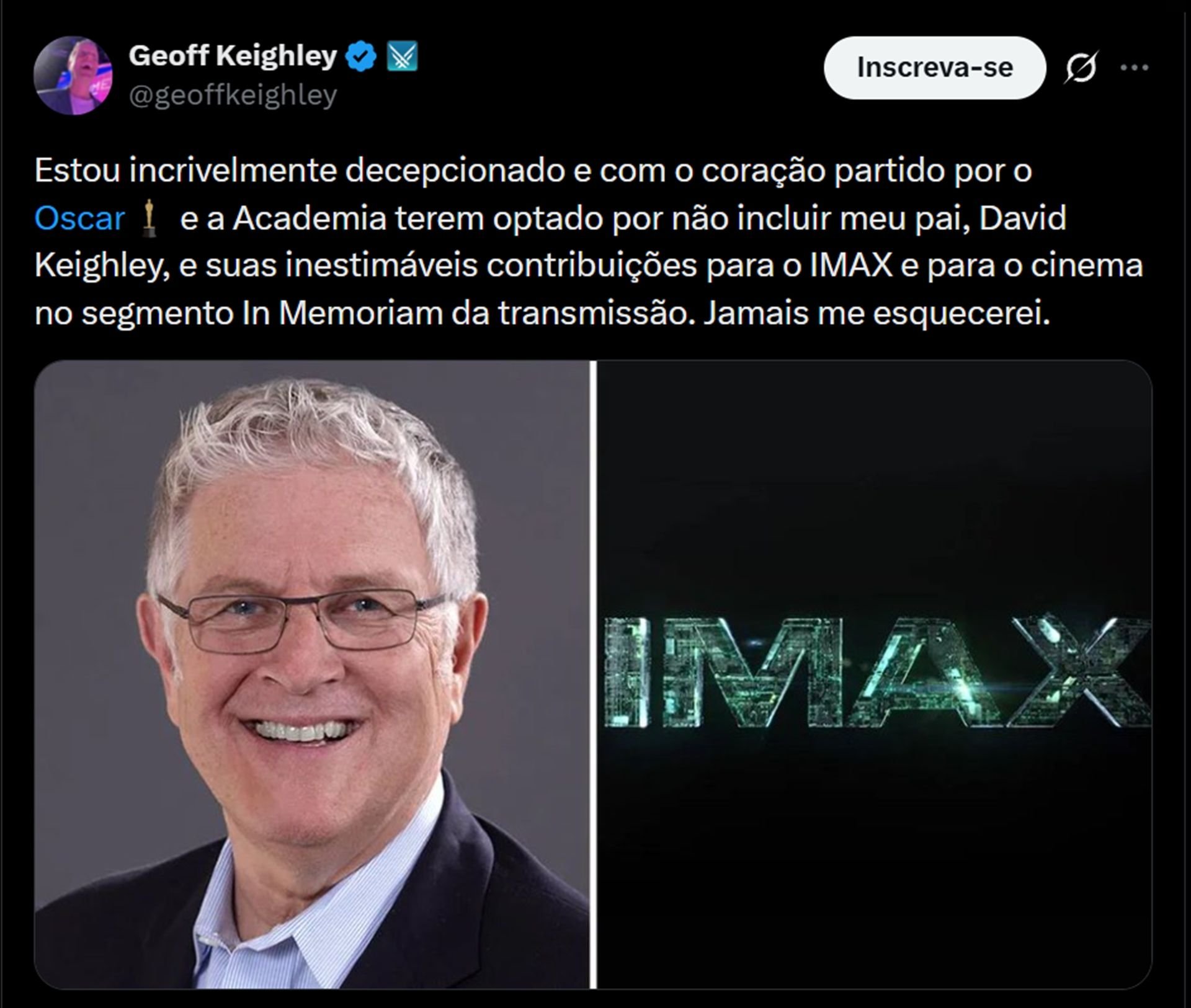“Estou incrivelmente decepcionado e com o coração partido pelo Oscar e a AMPAS terem optado por não incluir meu pai, David Keighley, e suas inestimáveis contribuições para o IMAX e para o cinema no segmento In Memoriam”, escreveu Geoff.