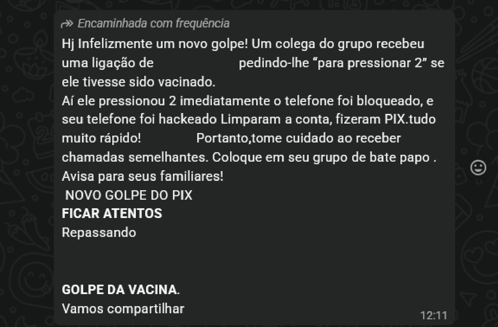 Circula em grupos do WhatsApp uma mensagem sobre o suposto novo “Golpe do Pix”, ou “Golpe da Vacina”, capaz de roubar dados e “zerar” contas bancárias. O conteúdo é totalmente falso e não oferece risco, apesar do frequente encaminhamento de mensagens enviadas nos últimos dias.