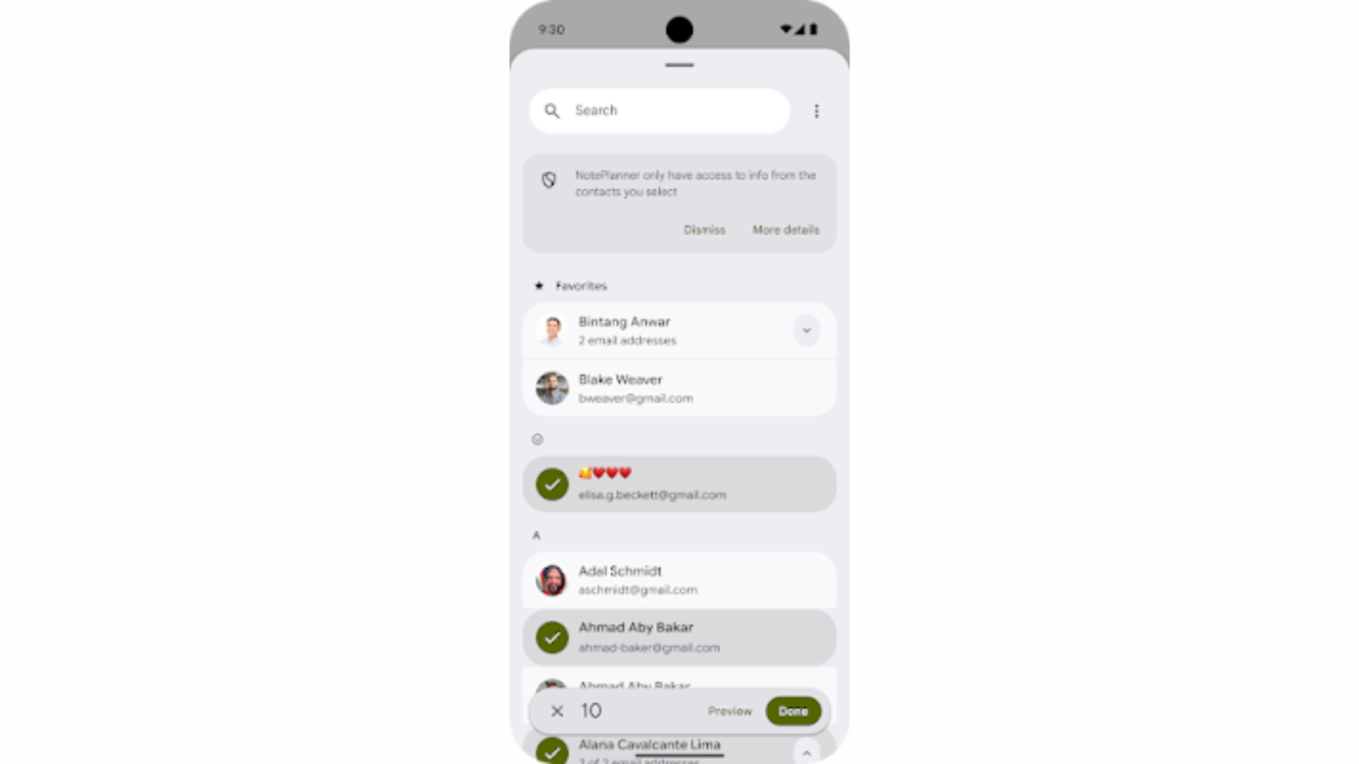 Interface do Contact Picker no Android: o usuário escolhe quais contatos específicos um app pode acessar, sem expor toda a agenda. A nova política do Google exigirá que apps usem esse mecanismo como forma principal de acesso a contatos a partir do Android 17. Imagem: Android Developers Blog.
