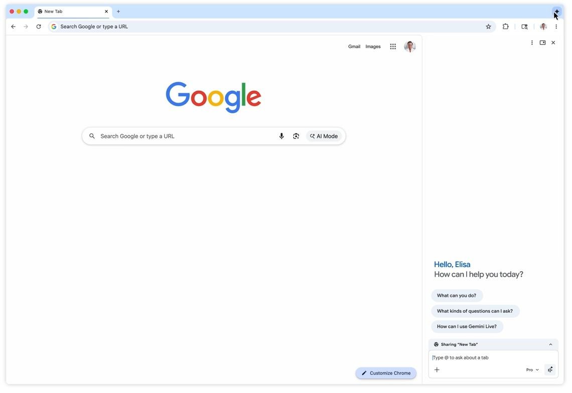 A IA agora pode ser acessada por usuários do Chrome a partir de um botão no canto superior direito da janela que, em vez de abrir a janela flutuante, agora coloca o chatbot no canto direito da tela.