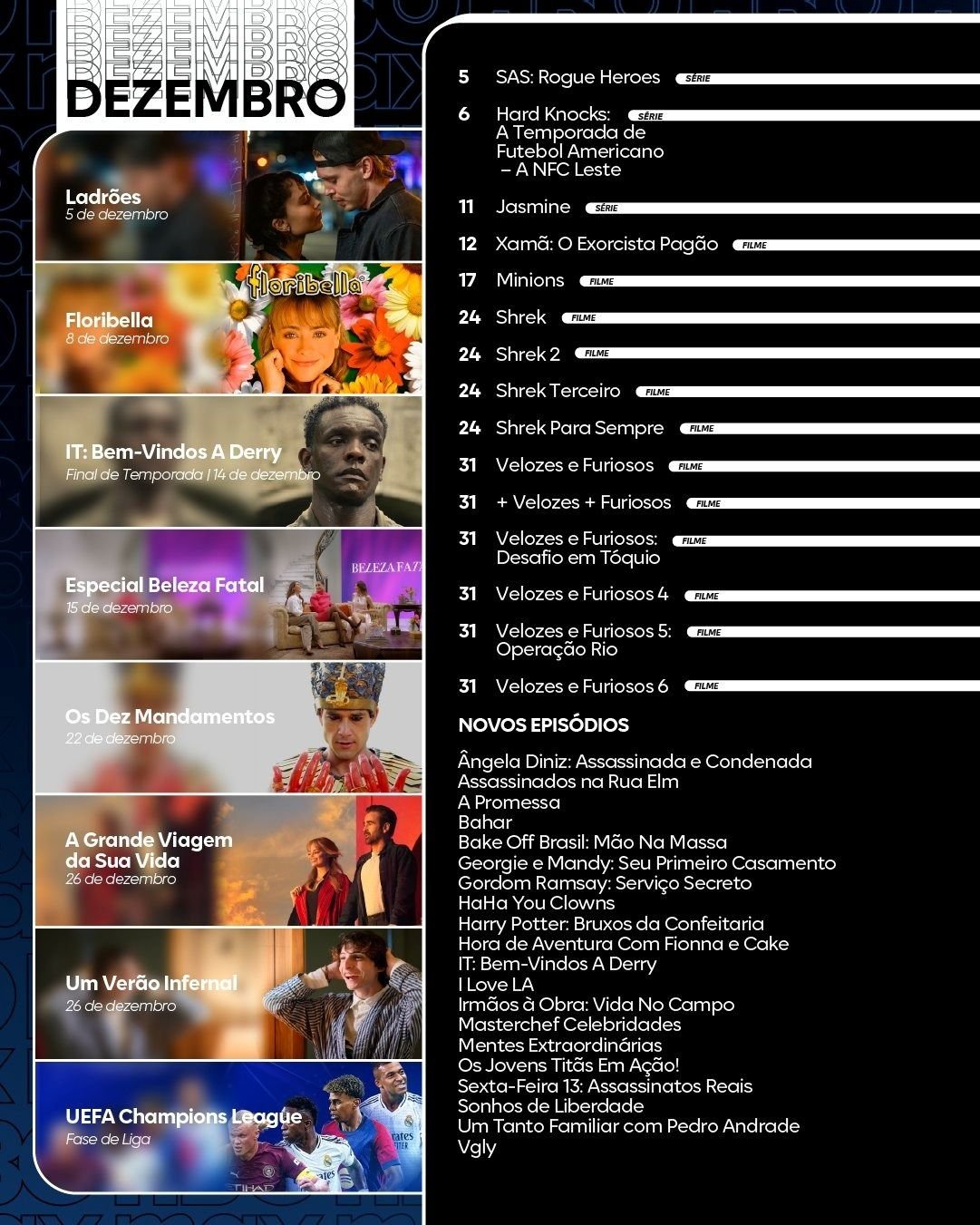 Este mês, a plataforma preparou um catálogo especial de filmes, que inclui os quatro capítulos de Shrek e nada menos do que seis Velozes e Furiosos. Já no campo das séries, finalmente chegou a vez de o público poder conferir , Instagram, TikTok e até mesmo no WhatsApp. Venha acompanhar filmes e séries com a gente!