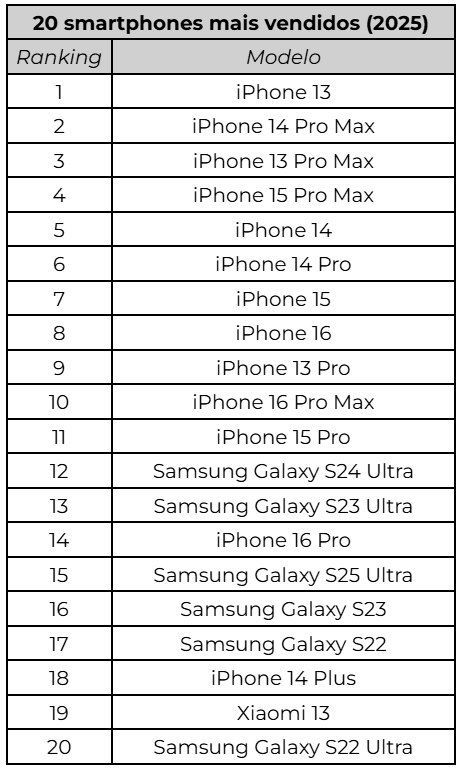 - Mesmo com o apelo global, smartphones de marcas chinesas não apareceram nesse levantamento;