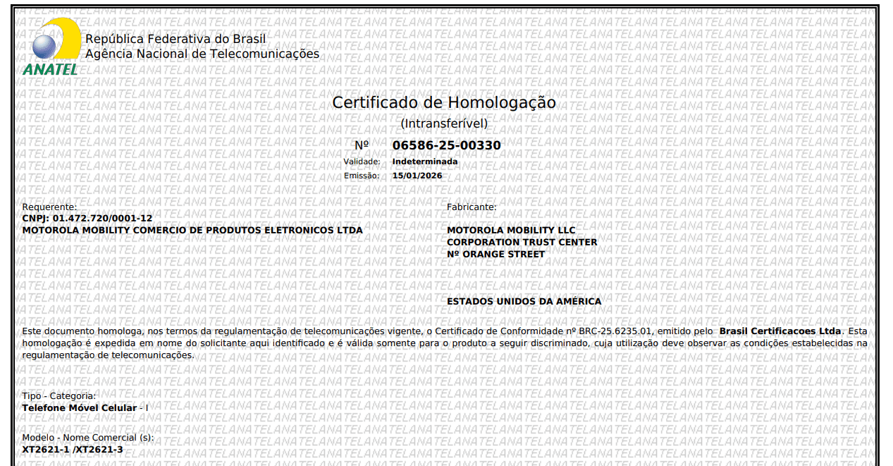 O Moto G77 foi certificado pela Anatel e pode ser vendido no Brasil. (Fonte: Anatel/Reprodução)