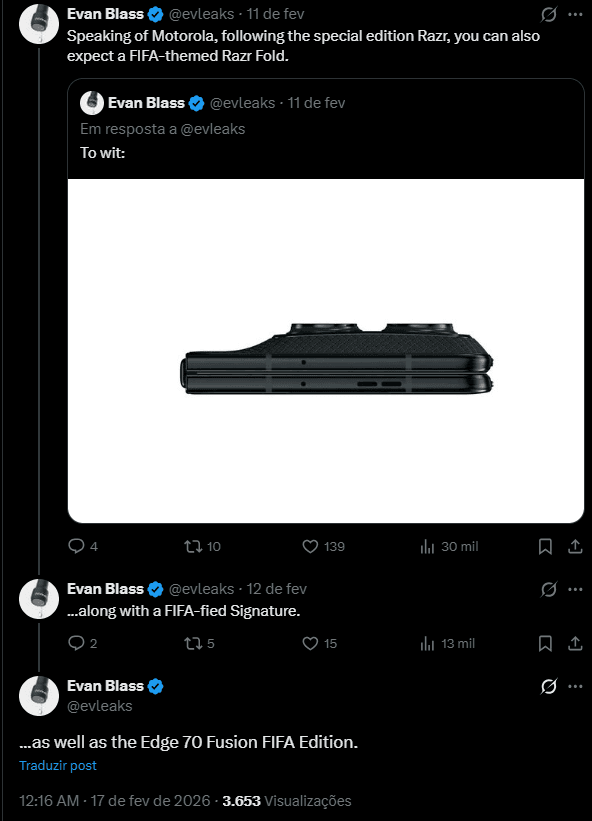 O visual das novas versões ainda não foi divulgado. O único modelo mostrado até agora, o Motorola Razr Fifa World Cup 2026 Edition, aposta em cores que remetem à competição e exibe a logo oficial do torneio, com uma proposta bastante chamativa.