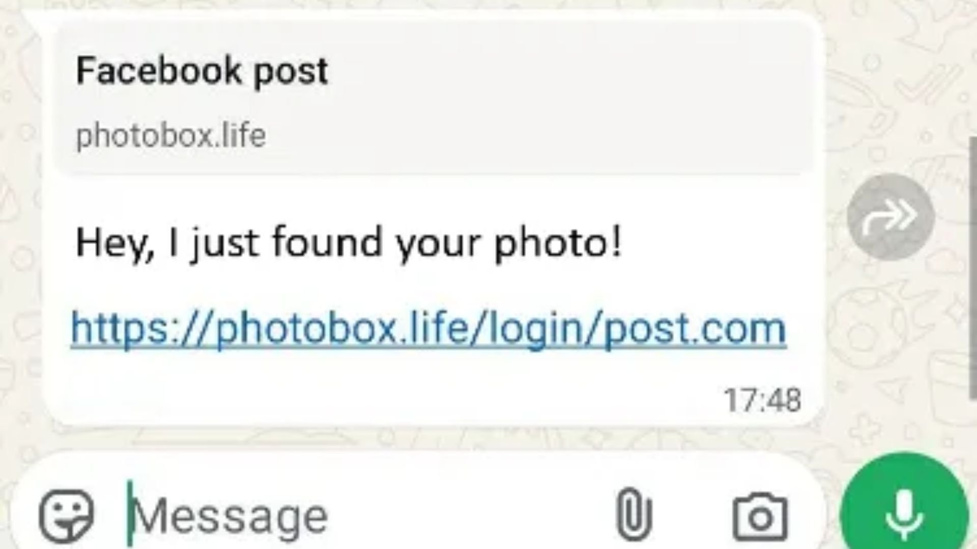Exemplo de mensagem encontrada na investigação, o texto diz: “Olá, eu acabei de encontrar sua foto!” e inclui o link do site falso. Imagem: Gen Digital.