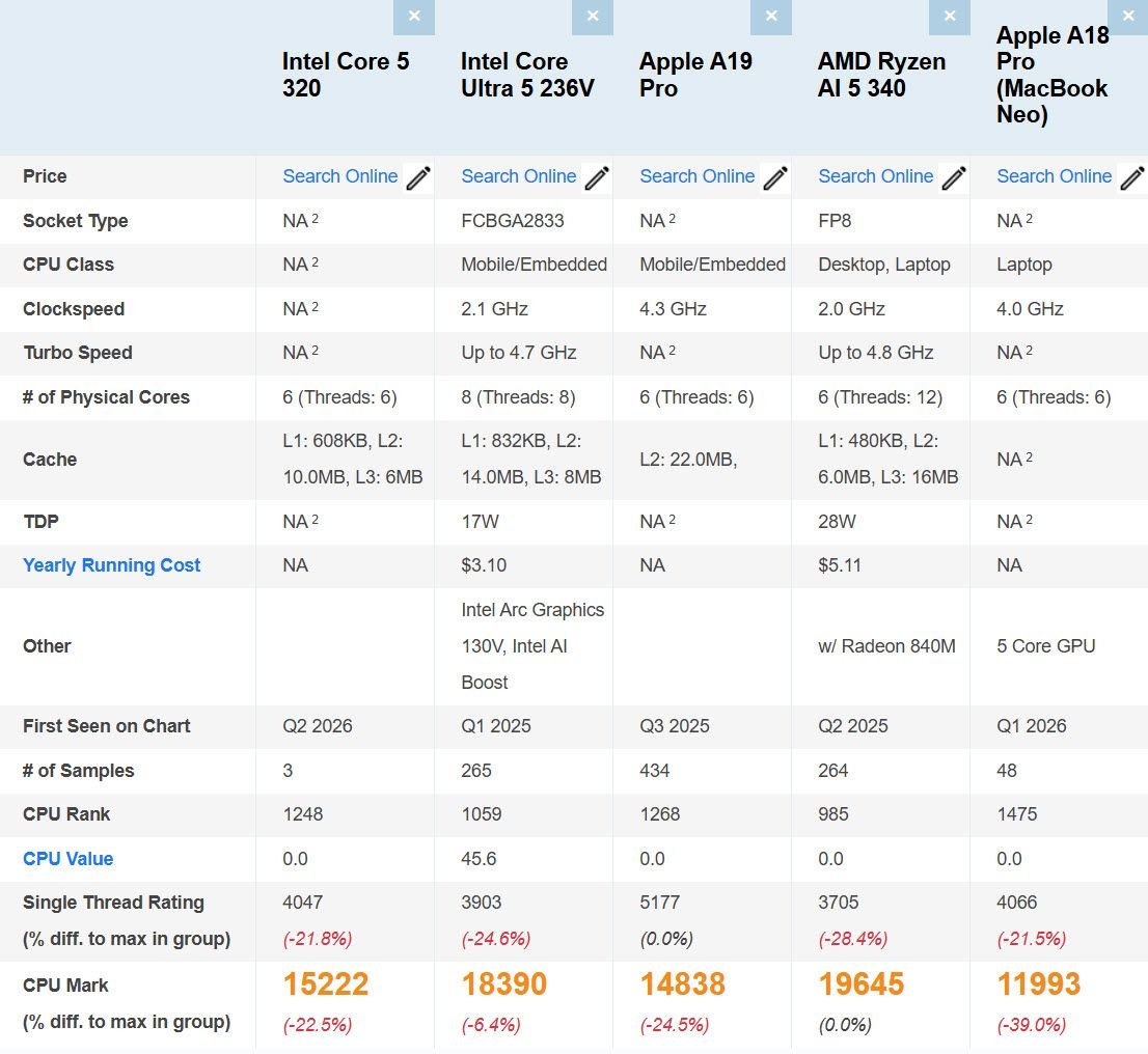 O benchmark que mostra os melhores números é o do PassMark, onde o Intel Core 5 230 foi testado e consegue superar o chip A18 Pro presente no Mac Neo. Na ocasião, a plataforma da Intel registra 4.047 pontos em single-thread e 15.222 em multi-thread, empatando com o A18 Pro em single e superando o chip por 26% em multi-thread.