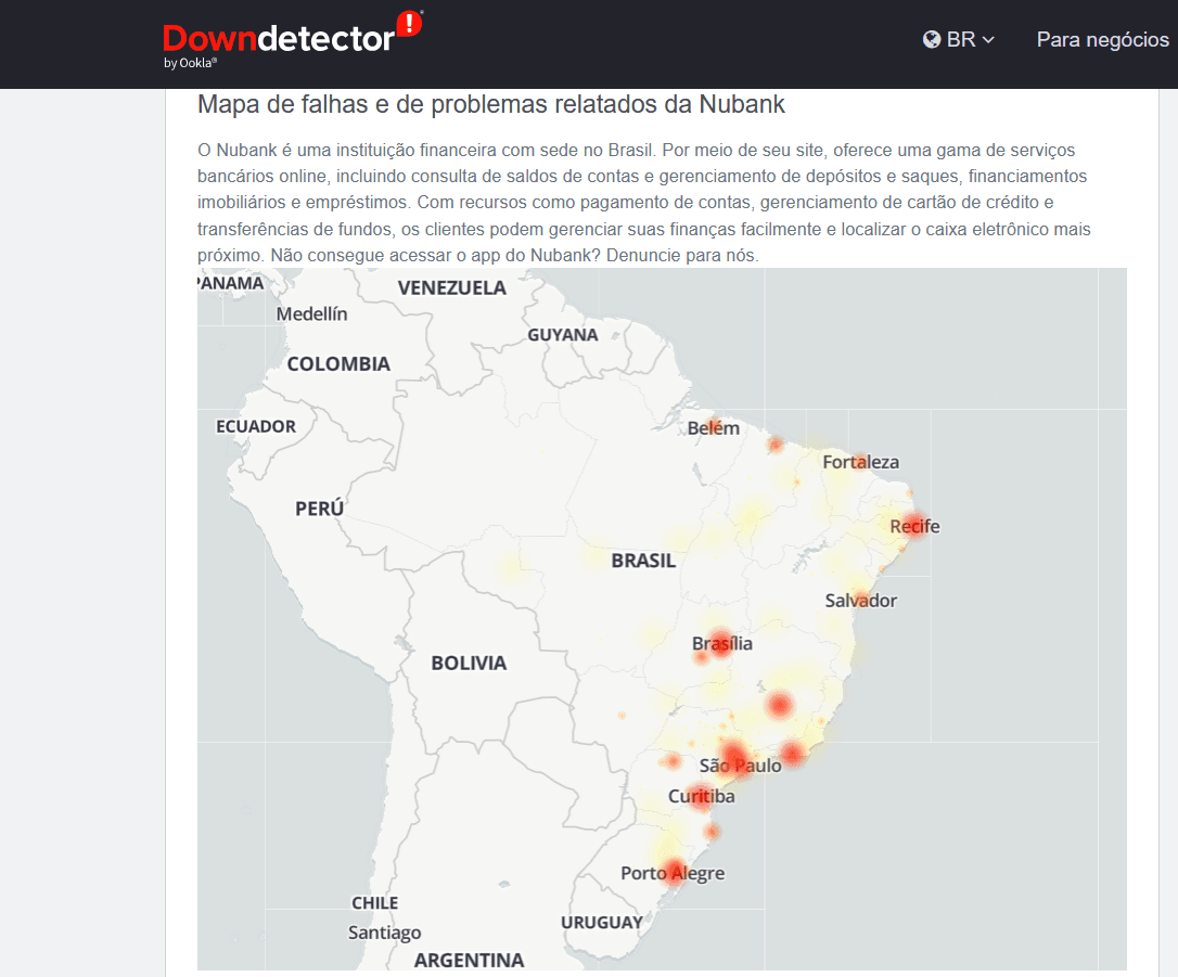 De acordo com o Down Detector, houve um aumento no número de notificações de erro por volta das 10h15 (horário de Brasília). Às 10h30, o site de monitoramento já analisava quase 300 reclamações sobre problemas no Nubank.