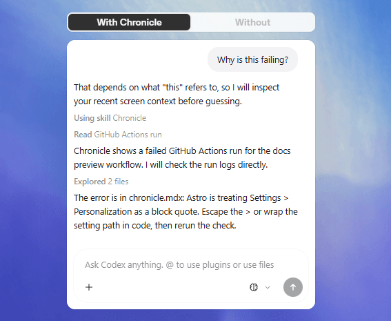 Em um dos exemplos fornecidos pela empresa, o usuário pergunta “Por que isso aqui não está funcionando?” e o Codex, usando o Chronicle, identifica o contexto e fornece as instruções adequadas.