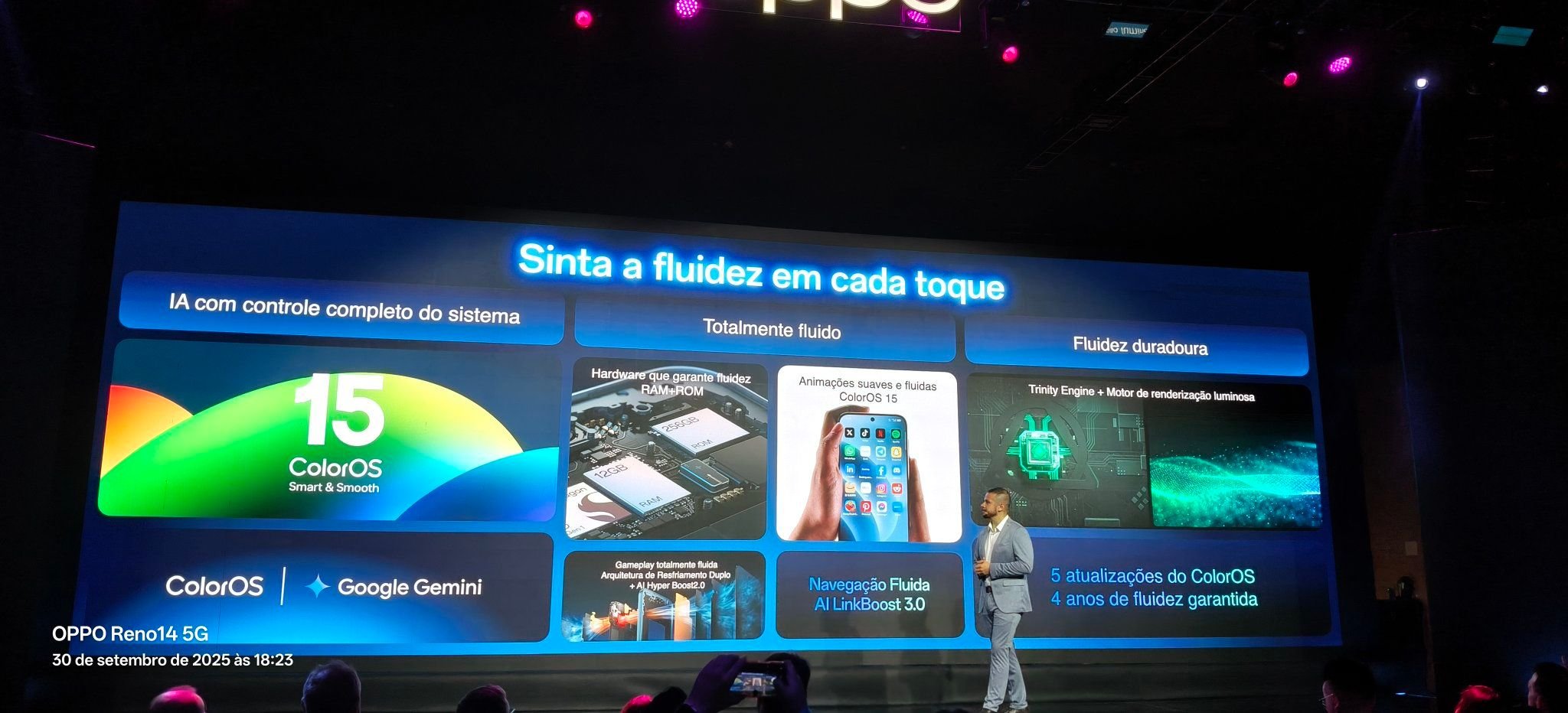 O Oppo Reno 14 F tem suporte a 5G, NFC, até 8 GB de RAM, 256 GB de armazenamento e proteção IP68. O celular começa a ser vendido nesta quarta-feira por R$ 3,5 mil.
