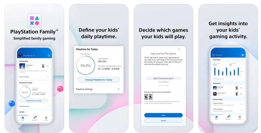 - Controle de tempo de jogo: defina limites para cada dia da semana; filhos podem pedir mais tempo no console e os pais aprovam (ou não) pelo app em tempo real.