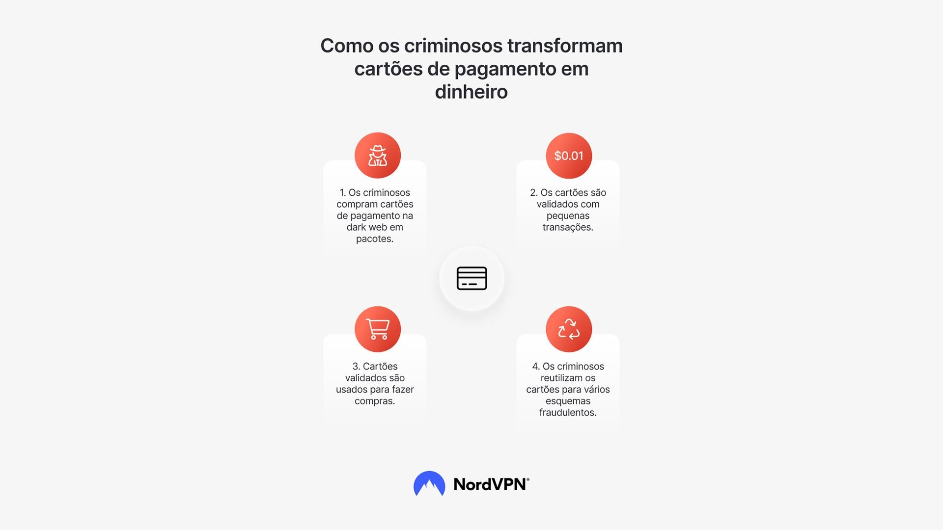 O relatório apresenta um levantamento da NordStellar, que apurou metadados de 50.705 cartões anunciados publicamente em mercados da Dark Web até maio de 2025. Durante o processo de análise, a equipe da NordVPN também registrou o ecossistema criminoso que alimenta às vendas, que conta com processos separados em diversas etapas.