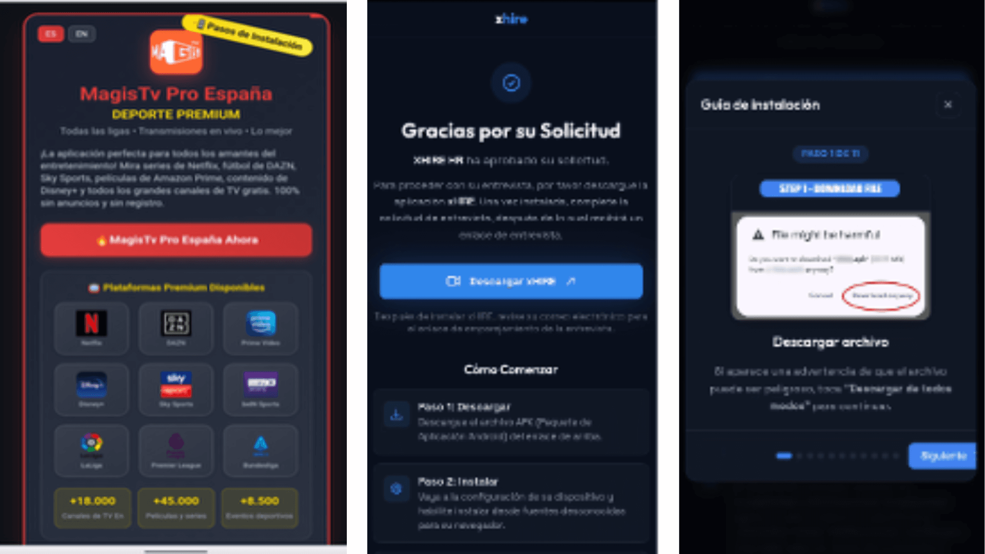O SaferRat se apresenta como portal de acesso gratuito a plataformas de streaming premium. O RecruitRat monta sites inteiros de recrutamento falsos, com visual profissional, que induzem candidatos a baixar um suposto aplicativo necessário para o processo seletivo.