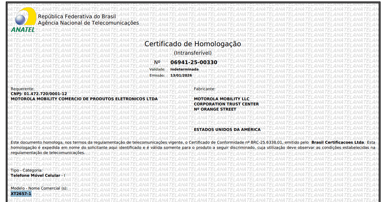 No documento, a Anatel certifica um smartphone da Motorola identificado pelo código XT2657-1. A numeração coincide com uma das variantes do Motorola Razr 70 vazadas no início de janeiro pelo informante Evan Blass (@evleaks, no X), reforçando que se trata do próximo dobrável da marca.