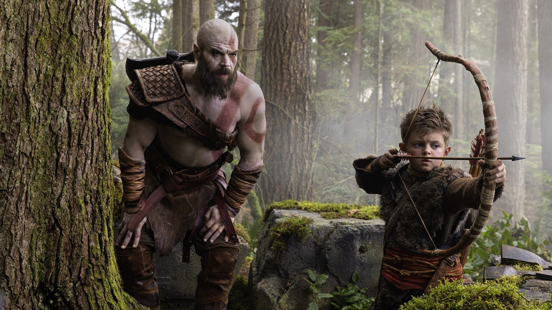 Na imagem, Kratos é interpretado por Ryan Hurst, enquanto Atreus ganha vida por Callum Vinson. A produção está em pré-produção e adapta os eventos de God of War (2018) e God of War Ragnarök (2022), acompanhando a jornada de pai e filho pelos reinos da mitologia nórdica.