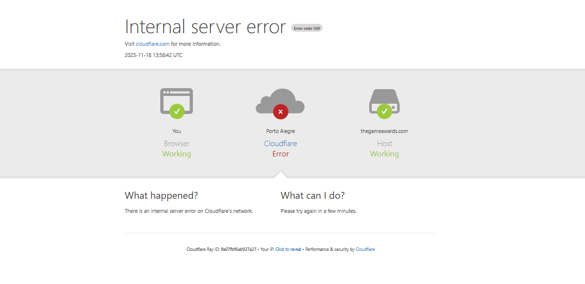 A falha do Cloudflare está afetando diversos sites e plataformas online, com o The Game Awards sendo apenas um dos afetados. O problema de infraestrutura online da Cloudflare, que começou na manhã desta terça (18), também derrubou a rede social X, serviços como Canva e até o ChatGPT.