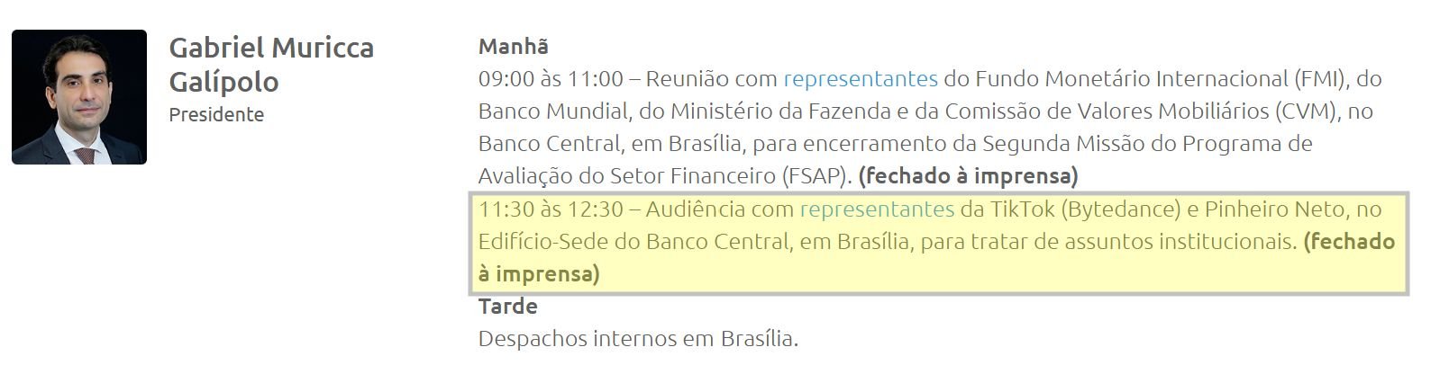 Ainda de acordo com a Reuters, executivos da ByteDance (dona do TikTok), incluindo Liao Baohua, chefe de Pagamentos Globais, e o presidente do Banco Central, Gabriel Galípolo, teriam se reunido em Brasília na manhã de hoje. A informação consta na Agenda de Autoridades divulgada pelo Banco Central.