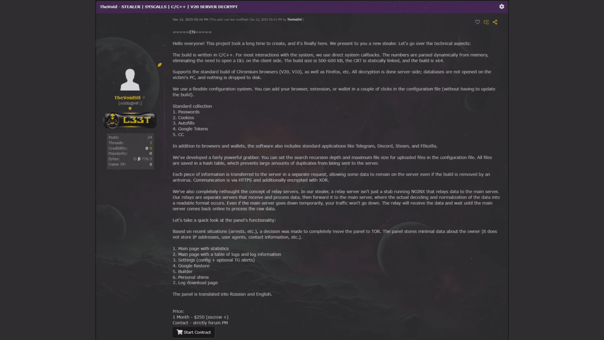 O VoidStealer é uma plataforma de malware como serviço (MaaS). Ele está sendo anunciado em fóruns da dark web desde pelo menos meados de dezembro de 2025. O malware introduziu o novo mecanismo de contorno da ABE na versão 2.0.