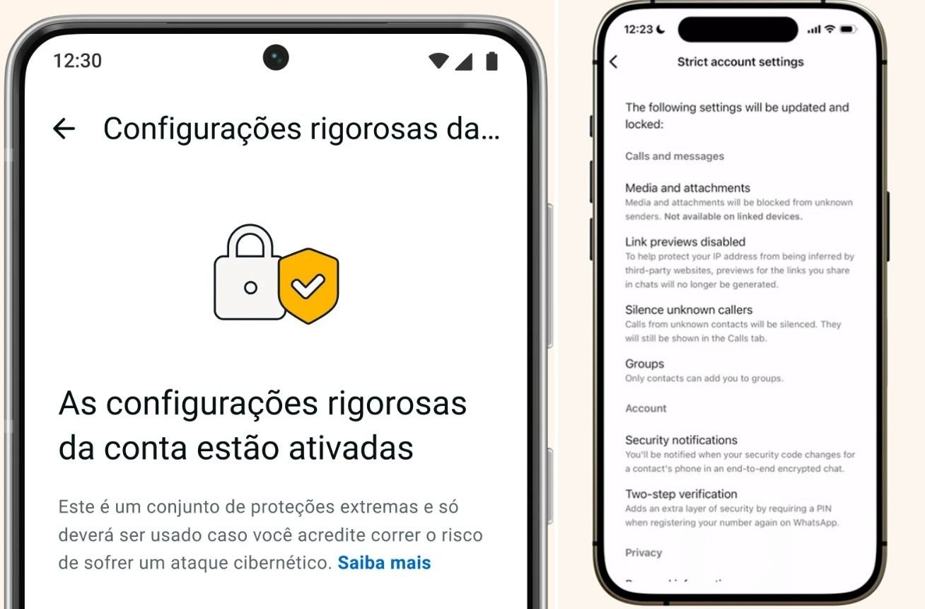 Para ativar a segurança aprimorada do WhatsApp na sua conta, vá em Configurações > Privacidade > Configurações avançadas. Lá, toque em “Configurações rigorosas da conta” e ative o recurso, caso ele já esteja disponível.