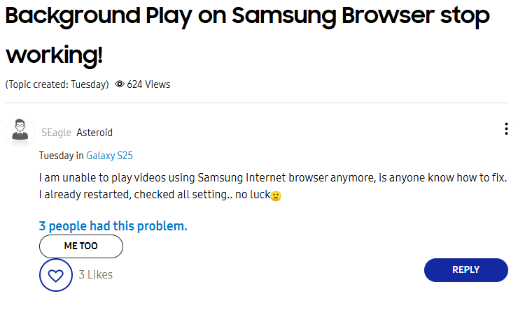 O recurso também parou de funcionar no app Samsung Internet. (Fonte: Samsung Community/Reprodução)